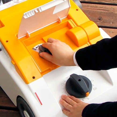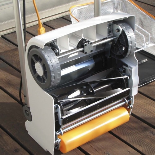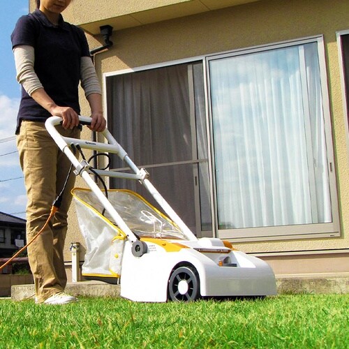 電子の力で回転数を制御「電子芝刈機」固定刃は、切れ味抜群の2面研磨刃 |