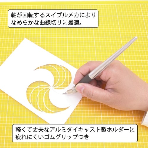 軸が回転するスイブルメカにより、なめらかな曲線切りに最適なデザインナイフ。 |