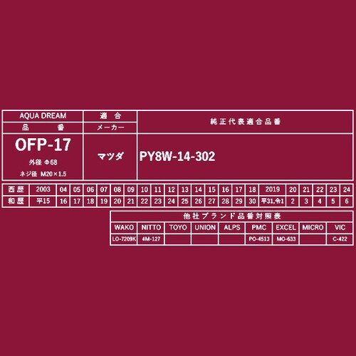 AQUA DREAM PLATINUMオイルフィルターは国産車に対応し、金属粉やスラッジを除去してオイルを清浄に保ちます。燃費向上とエンジン寿命延長に貢献。交換目安は5000kmまたは年1回です。 |