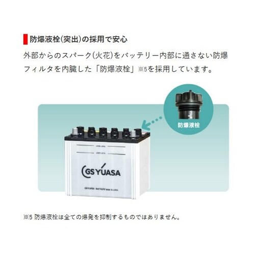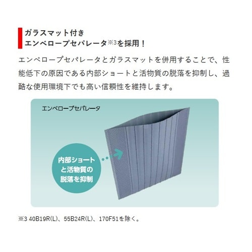 鋳造式グリッドと高密度ペーストで振動下でも高性能、エンベロープセパレータと防爆液栓で安心、使用開始ラベル付きで管理も容易、通常車24ヵ月6万km・アイドリングストップ車12ヵ月3万kmの保証です。 |