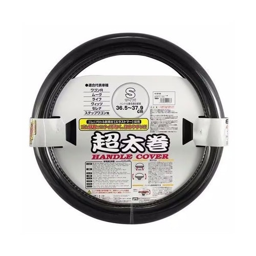 ビニール巻きの超太巻モケット仕様ハンドルカバーは、黒のシンプルなデザインで高級感を演出します。直径36.5−37.9cmのSサイズに対応し、快適なグリップ感とドレスアップ効果を備えた実用的アイテム。 |