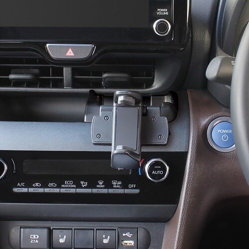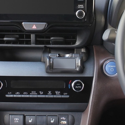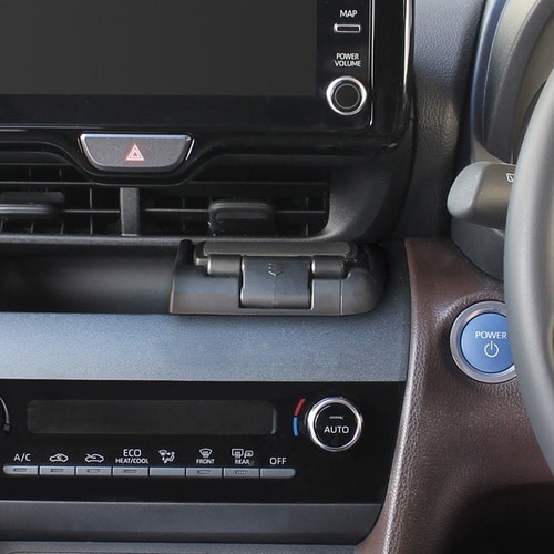 ヤリスクロス右ハンドル車専用のスマホホルダーは専用設計で内装にフィットし、運転席から見やすい位置に設置可能です。縦横90°回転に対応し、幅56−79mm・厚み18mmまでのスマートフォンを固定可能。 |