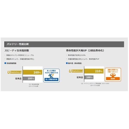 ECHNOアイドリングストップ車用バッテリーがリニューアル。負極活性炭を改良し充電回復性能向上。保証は通常車・充電制御車36か月または10万km、アイドリングストップ車36か月または6万km。 |