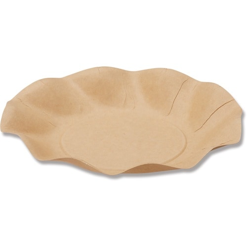 プラスチックの廃棄削減に貢献する、環境に優しいクラフトの紙皿です。お花の形に開いたようなフォルム。食品衛生法に順じて製造し、表面はPEコーティングされていますので、ある程度の水分・油分に耐えます。 |