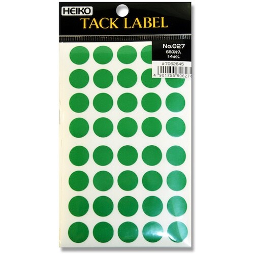 直径14mmのシンプルな緑色の丸いシールです。ちょっとしたアクセントや、他色と組み合わせて分類の目印などに。 |