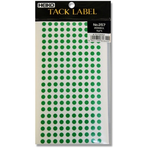 直径5mmのシンプルな緑色の丸いシールです。ちょっとしたアクセントや、他色と組み合わせて分類の目印などに。 |