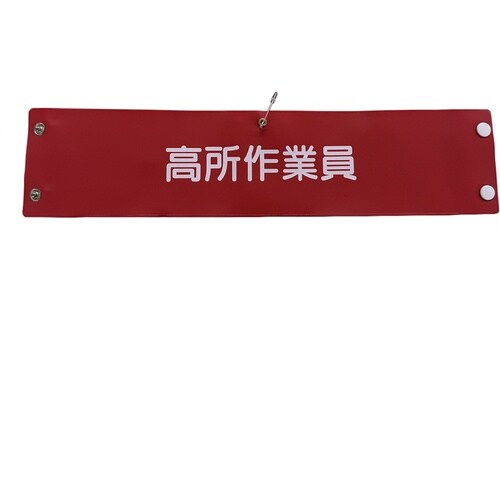 表示内容:高所作業員 | 色:赤 | 縦(mm):90 | 横(mm):400 | 取付方法:ホック、安全ピン | 材質・仕上げ:軟質塩化ビニール製 …