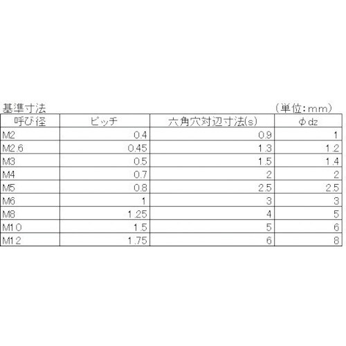 寸法(mm)d:M12 | 寸法(mm)L:40 | ねじピッチ(mm):1.75 | 六角穴対辺寸法(mm):6 | 先端形状:くぼみ先 | ねじ径…