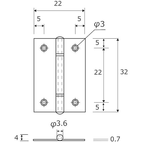 全長(mm):32 | 幅(mm):22 | ねじ穴数:4 | 規格(mm):32 | 仕上げ:金色焼付塗装 | 穴径:3.5Φ | 板厚(mm):1…