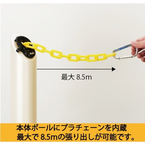 8.5mの反射板付プラチェーンが本体ポールに内蔵しています。不使用時にプラチェーンをポールに収納できます。工場内や作業場所などでの区画整理に。 |