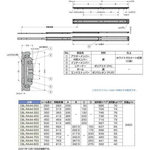 スガツネ工業 SUGATSUNE (190114113)CBL−RA44−800スライドレール CBLRA44800 1本 A01K-1080