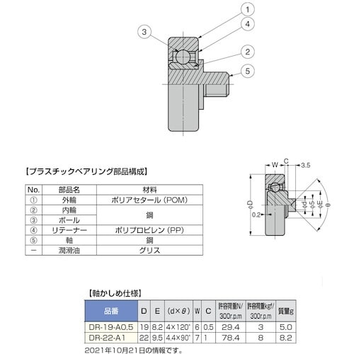 ベアリングの材料として最適なポリアセタールを使用しているため、耐摩耗性が大変優れており、摩擦係数が低く、潤滑油なしで軽快、低騒音の回転が得られます。耐腐蝕性、耐薬品性、耐候性に優れています。