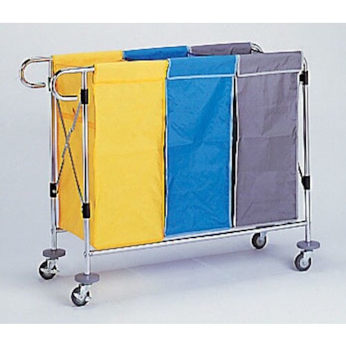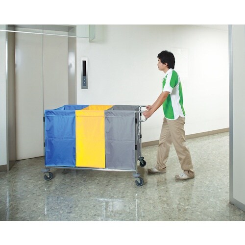 一台に3枚の袋がセットできる小型回収カートです。自立したまま厚さ160mmに折りたためるので収納場所も取らず、カートをまとめてエレベーターにのせられます。 |