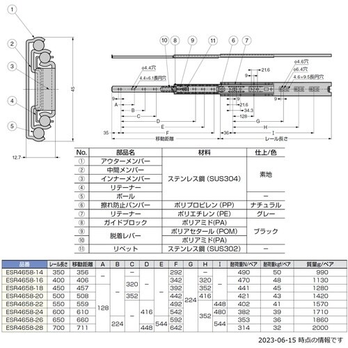 インナーメンバーを完全に引き出せる3段引のスライドレールです。レバー操作でインナーメンバーを取り外せます。 |