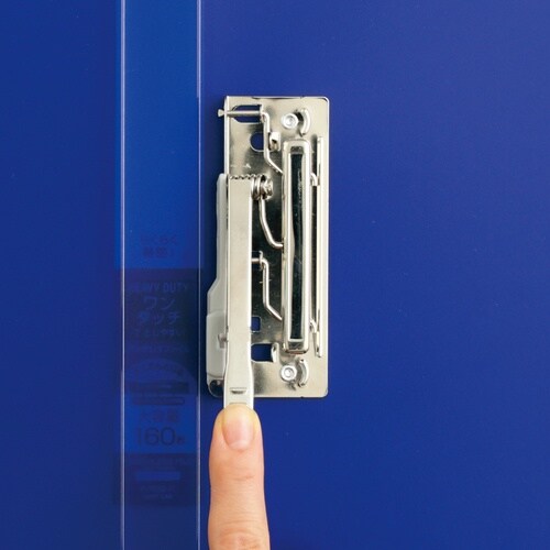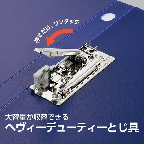棚から取り出しやすいフィンガーホール付き。大容量が収容できるヘビーデューティーとじ具。大容量160枚収容タイプ。穴を開けたくない書類の整理・保管・収納に。 |