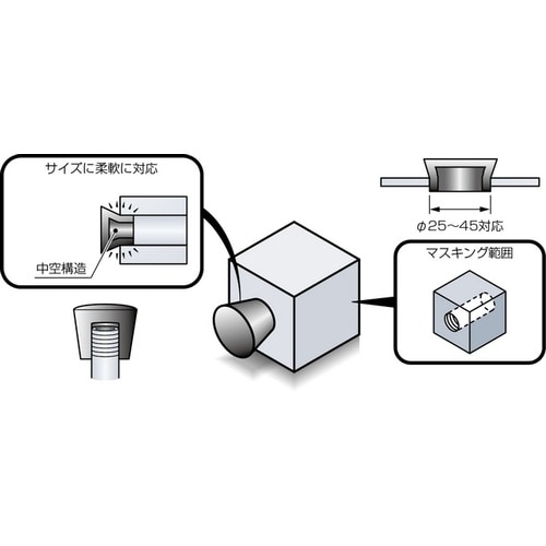 シリコン製プラグに比べて安価です。大口径部のマスキングに最適です。中空構造のため、柔軟にフィットします。寸法公差は、ISO 3302−1 Class M4に準拠。