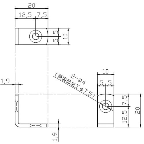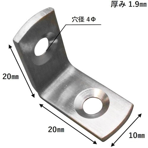 板厚(mm):1.9 | 穴径(mm):4 | 穴数(個):2 | W(mm):10 | L1(mm):20 | L2(mm):20 | 材質・仕上げ…