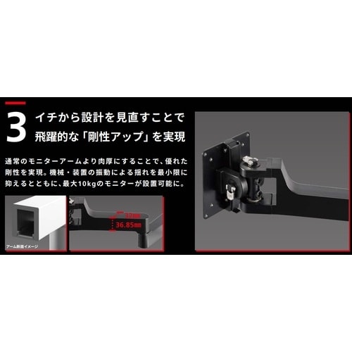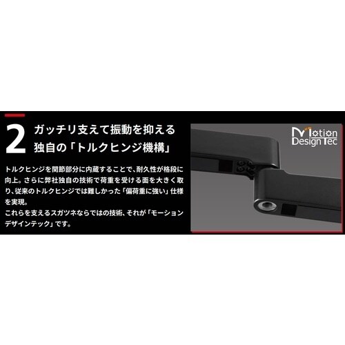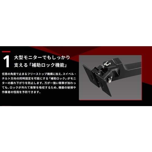 アームの剛性が高いため、タッチパネル・モニター操作時のチャタリング(微振動によりON・OFFを繰り返す誤作動)が起きづらい仕様です。チルト方向とスイベル方向に任意の位置でフリーストップします。 |