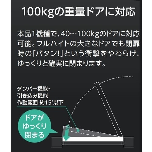 | 注意事項 | ※適応ドア質量/15ー40kgのLDD−V型もございます。ドア幅が900mmを超える場合はお問い合わせください。 |