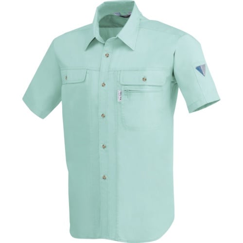 軽量の樹脂ボタンを採用したボタンアップ仕様のシャツです。こちらにもブルゾン同様に、左胸にはファスナーポケット付きのフラップポケットを配して、使い勝手の良さとともにデザイン性も高めています。 |