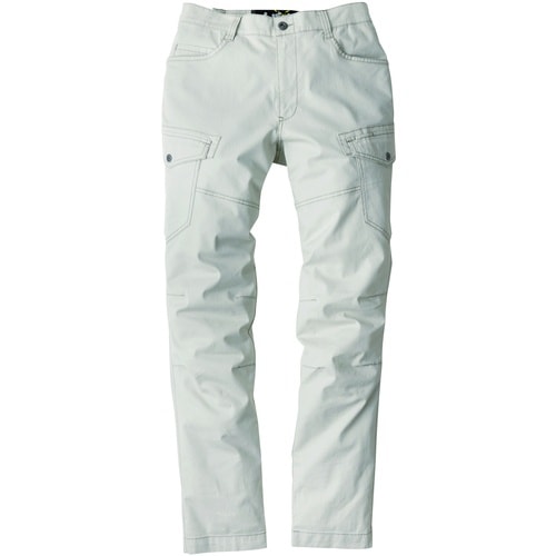 洗い加工を施した生地はユーズド感がありながらも、ドビー織の凹凸感でハードな印象を与えます。ストレッチ素材とやわらかい風合いで着用時の窮屈感を軽減します。裾にヒモ穴があり絞っての着用も可能です。 |
