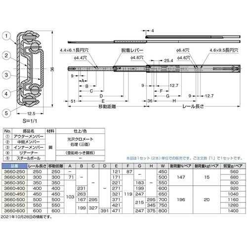スガツネ工業 SUGATSUNE (190027558)3660−600スライドレール 3660600 1S(2本) A01R-0525