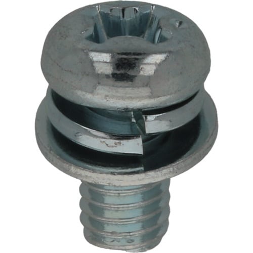 十字穴付なべ小ねじにばね座金と小型平座金が組込まれており、脱落しません。組込み式なので作業効率が向上します。材質は鋼で耐食性向上のため、三価クロメートめっき(薄青っぽい色)がしてあります。 |