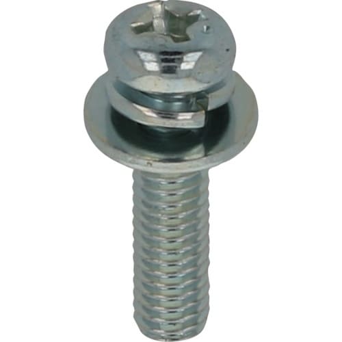 十字穴付なべ小ねじにばね座金とISO平座金が組込まれており、脱落しません。組込み式なので作業効率が向上します。材質は鋼で耐食性向上のため、三価クロメートめっき(薄青っぽい色)がしてあります。 |