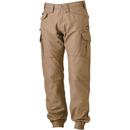 肌触りが良く吸湿性のある綿100%ツイル(裏使い)素材です。火を扱う現場にも対応した仕様です。製品洗いによるソフトな風合いと防縮性があります。裾を絞って足元すっきりのジョガーパンツ仕様です。