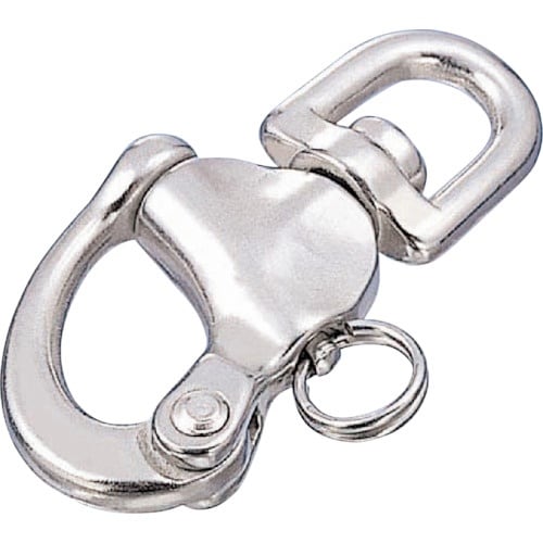 アイの部分が回転するので、つないだチェーンなどがよじれません。リングを引くとフックが外れます。チェーン・ワイヤ・ロープ等の連結金具として、また端末の金具のジョイントに。