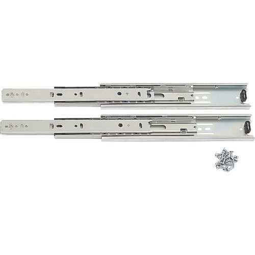 インナーメンバーを完全に引き出せる3段引のスライドレールです。レバー操作でインナーメンバーを取り外せます。レール全閉時にその状態を簡易的に保持します。全開時、全閉時の金属音を緩和する消音機構付です。 |