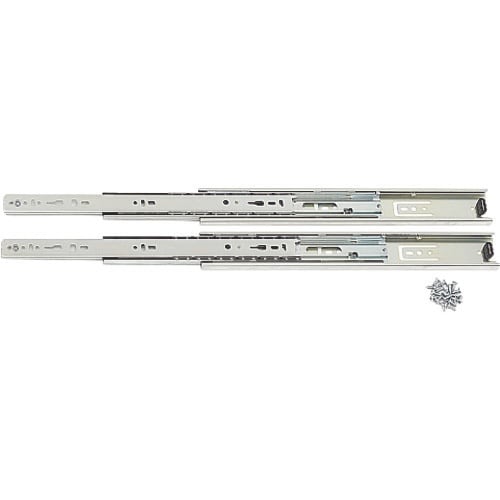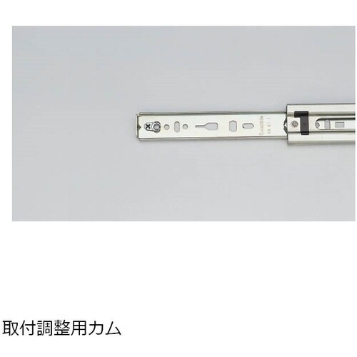 インナーメンバーを完全に引き出せる3段引のスライドレールです。レバー操作でインナーメンバーを取り外せます。レール全閉時にその状態を簡易的に保持します。全開時、全閉時の金属音を緩和する消音機構付です。 |