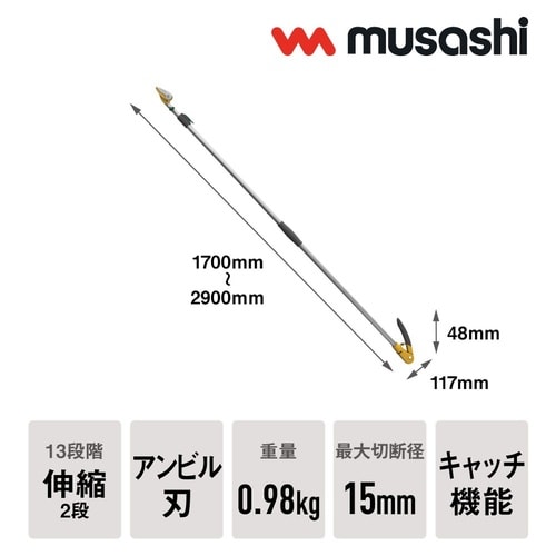 切る力50%軽減すご腕プッシュカット軽量タイプ1.7ー2.9mの13段階伸縮ができます。 |