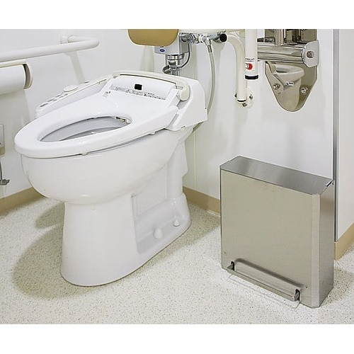 壁面にぴったり収まる、スリムな省スペースタイプです。手を触れずにフタを開閉できるペダル式です。フタはダンパー付きで、ゆっくりと閉まる静音設計です。 |