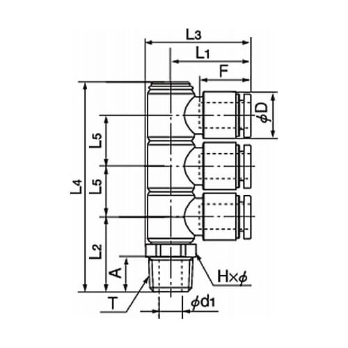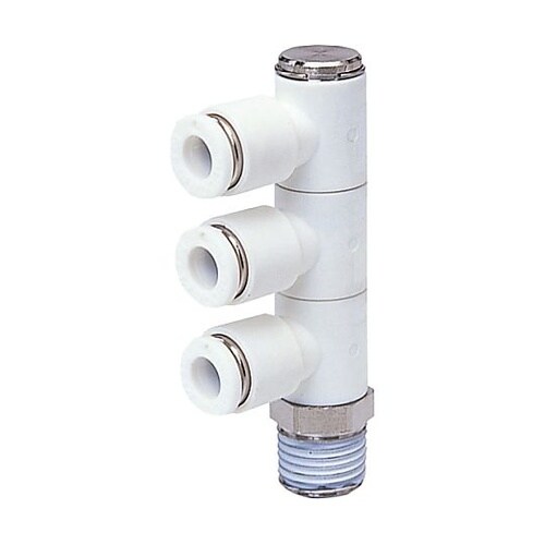 チューブはプッシュワン接続です。無電解ニッケルめっき処理を施しています。ホワイトボディが作業環境を明るくします。難燃性樹脂(UL94規格V−0相当)採用。Rねじ部にシール加工。 |