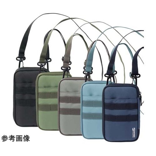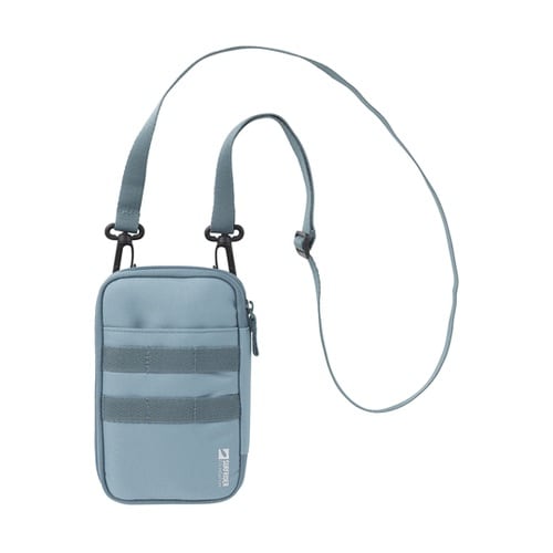 トラベル小物を持ち運びできるショルダーベルト付きポーチ。カラビナなどを取り付けられるベルト付き。背面はICカードの収納に便利な面ファスナー付きポケット。