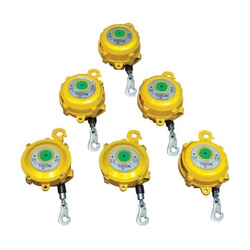 テーパー状のワイヤ巻取りドラムに内蔵された渦巻きばねと吊り下げ荷重のバランスで、吊り下げ物を引き出しストロークの範囲内で制止することができます。電気や空気などの動力を必要としません。 |
