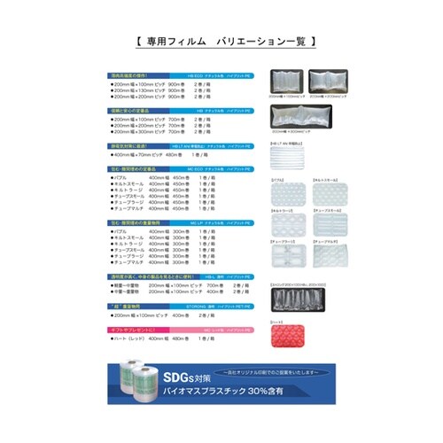 エアークッションマシーン最高グレード仕様のSAMURAI−AIR専用フィルムです。薄肉高強度を実現したハイブリッドフィルムとなり、耐荷重、ヒートシール性が非常に優れています。 |