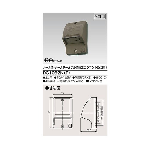 コンセントは回転抜け止め機能付。雨の飛沫、ホコリなどの侵入を防止する扉付です。露出・埋込配線兼用です。結線の容易なSL端子構造です。 |