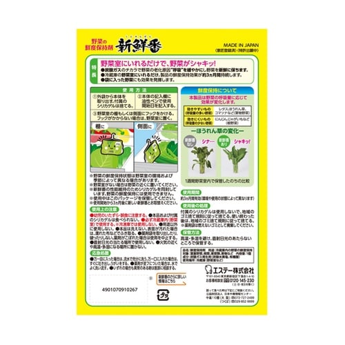 炭酸ガスのチカラで野菜の老化原因”呼吸”を抑制し野菜を新鮮に保ちます。冷蔵庫の野菜室に置くだけ。鮮度保持効果が3ヶ月間持続します。袋に入った野菜にも効果を発揮します。 |