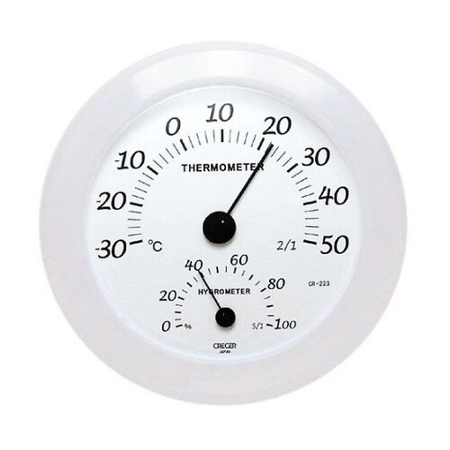 直径220mmの温湿度計です。背面に壁掛け用の穴があります。 |