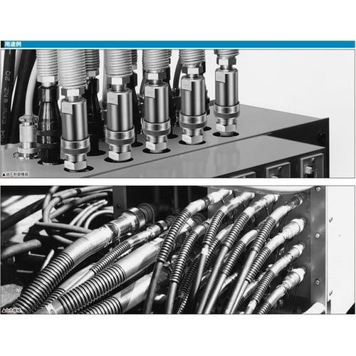 最高使用圧力20.6MPa{210kgf/cm2}の油圧用「カプラ」。圧力損失を低く抑える構造になっており、流量を必要とする油圧用途に適しています。自動開閉バルブを内蔵し、分離時の流体の流出を防止。 |
