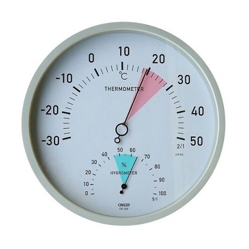 直径300mmの温湿度計です。適温・適湿を文字盤の色でわかりやすく表示背面に壁掛け用の穴があります。 |