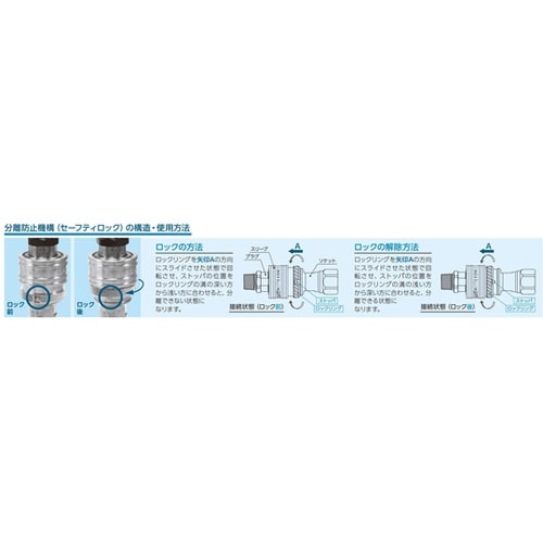 耐熱性に優れたシール材を採用。樹脂成型などの熱水用途に使用可能。標準仕様の分離防止機構で、振動や衝撃などによる接続後の不意な分離を防止。 |