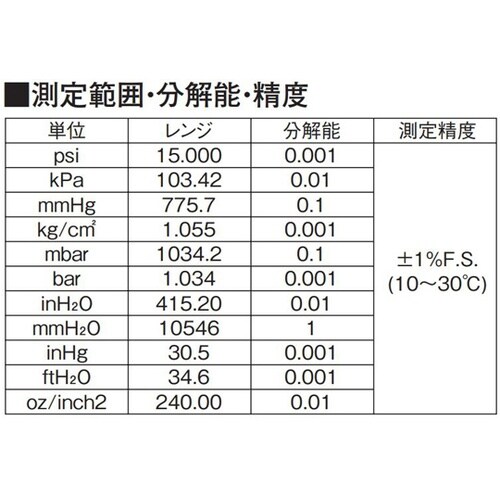 その他仕様:0.01〜103.42kPa | その他仕様:表示単位切替機能 | サンプリング:0.5秒・回 | 手動記録:99データ | ディスプレイ…
