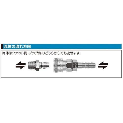 プラグ・ソケットのどちらからでも流体が流せる。工場内の空気配管から空圧機器のホース接続まで幅広い用途。重要な構成部品には熱処理を施し強度を向上。特に耐摩耗・耐久性に優れています。 |