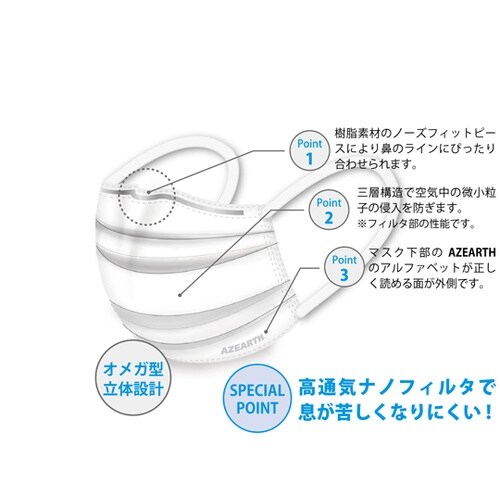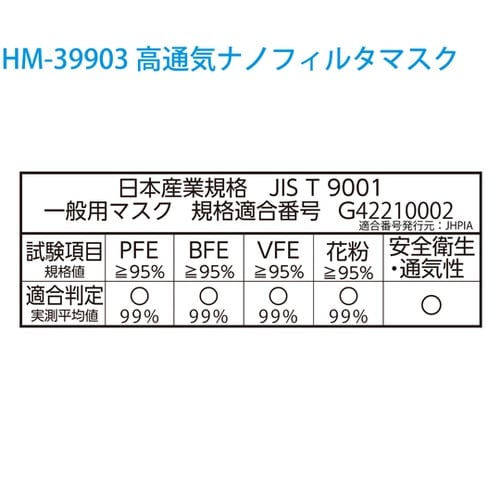 JIS適合審査においてJIST9001一般用マスクに適合と審査されました。呼吸のしやすさと高い捕集効率を実現します。高通気ナノフィルタで息が苦しくなりにくいです。 |