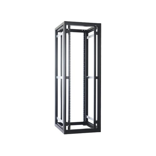 搭載可能質量は450kg(静止時)です。JISまたはEIA規格に準拠した、アルミフレーム仕様の19インチラックです。外装板付きの機種は、放熱性を重視した換気穴が開いている仕様です。 |