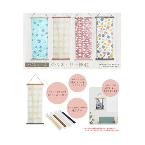 マグネット式のタペストリー棒です。手ぬぐいやポスターを挟むだけで簡単に取り付けができます。 |