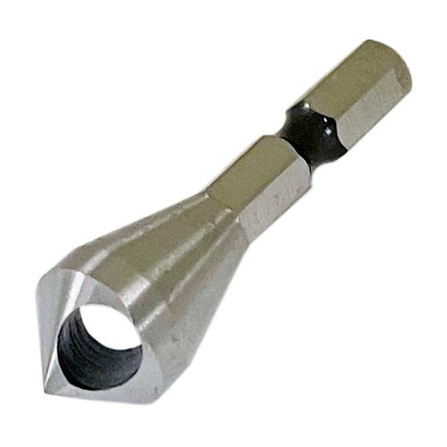 皿ビスの面取り、バリ取り等にご使用頂けます。穴あきタイプにより切屑のはけがスムーズです。6.35mm六角軸でドリルチャックにワンタッチで着脱可能です。※本来の用途以外で使用しないで下さい。 |